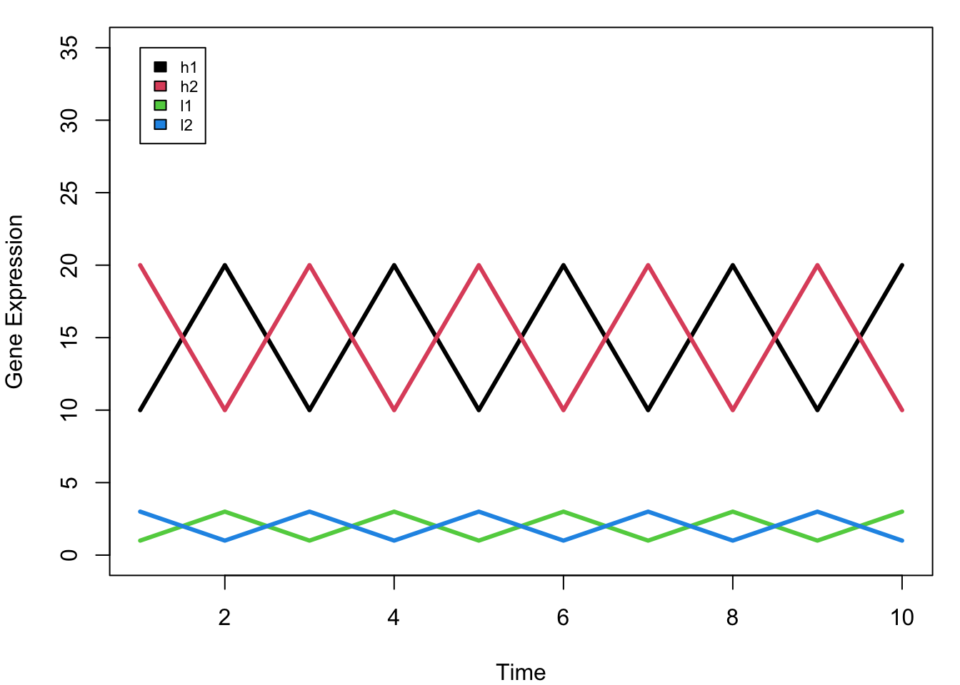 plot(1:10, rep(0,10), ylim = c(0,35), pch = "", xlab = "Time", ylab = "Gene Expression")